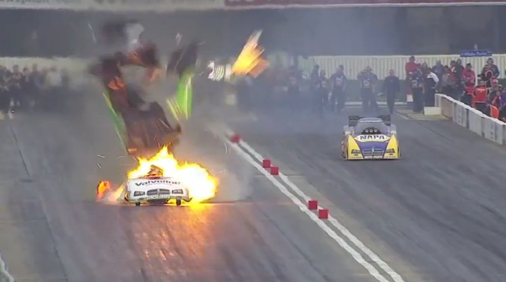 世界一のドライバー登録数を誇る全米ホットロッド協会のドラッグレースにおいて、まるでコントのようなクラッシュが発生しました。