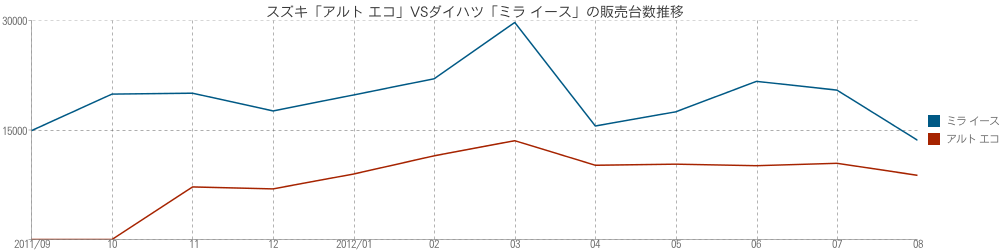 結論から言うとミラ イースの圧勝です。グラフを見てもらえば一目瞭然ですが、ミライースに対してアルトエコは今でのところ一度も売上で上回っていません。